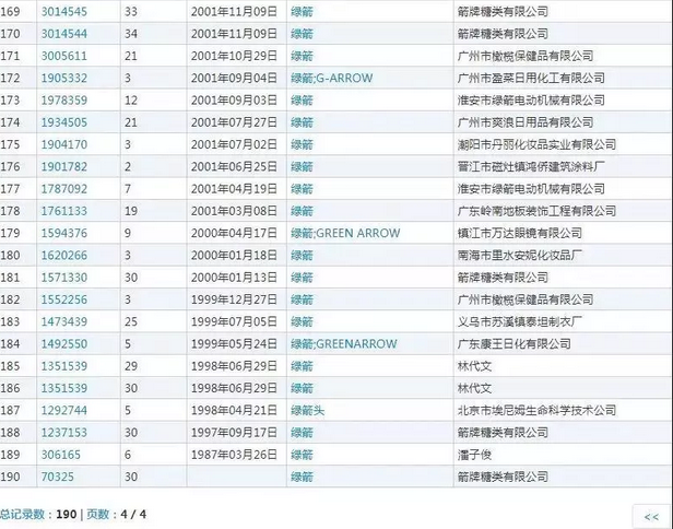 ↑“綠箭”相關(guān)商標(biāo)有190個
