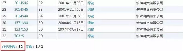 鷹飛國際查詢商標(biāo)局?jǐn)?shù)據(jù),“綠箭”相關(guān)商標(biāo)有190個,而屬于箭牌公司的僅有32個。