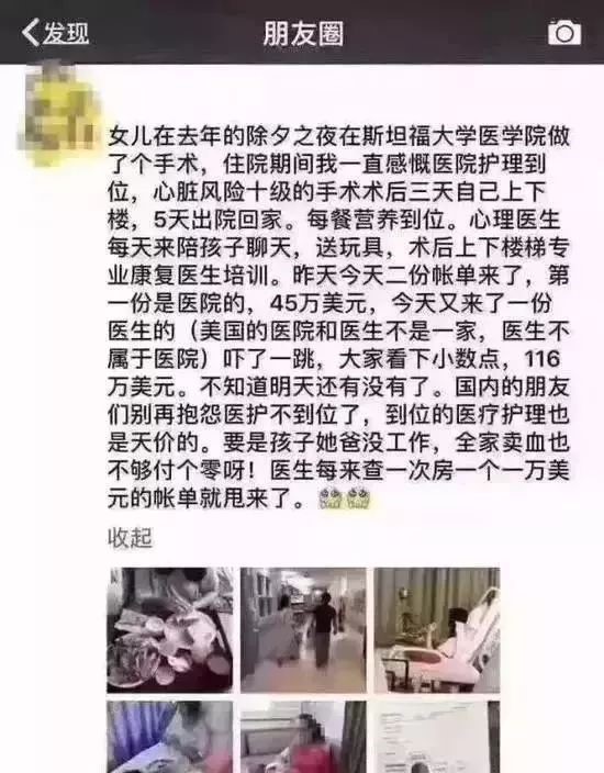 一位“裸險”女留學生在斯坦福大學醫院做了個有關心臟的手術,術后5天就出院回家。在家人都在慶祝女孩康復的同時,收到了美國醫院和醫生的兩份賬單,一共170萬美元,換算成人民幣竟然是1100多萬元!!