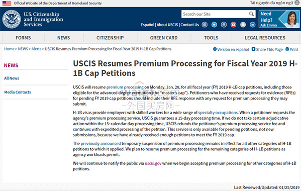 1月28日起美國恢復(fù)2019財(cái)年H-1B申請(qǐng)加急服務(wù)
