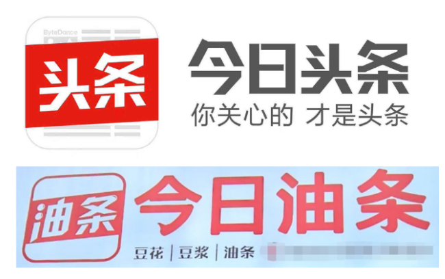 根據網上流傳的今日油條門臉照片,其不僅名稱與今日頭相似,字體配色與背景圖板顏色,也與今日頭條的白底紅字類似。還打出了“關心你的,才是好油條”的Slogan,和今日頭條的Slogan“你關心的,才是頭條”相似。