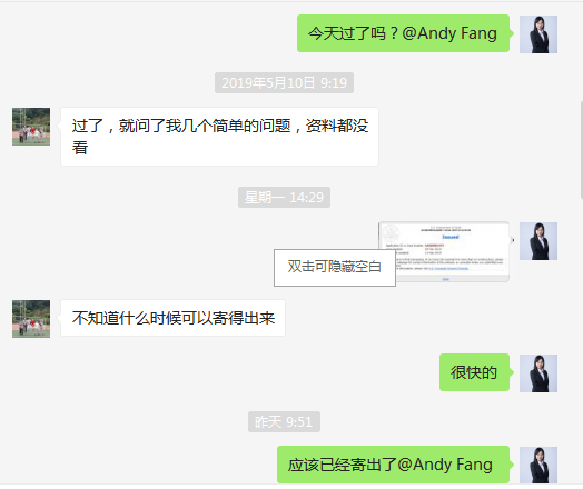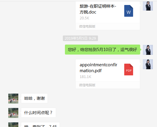 鷹飛國(guó)際簽單的時(shí)候,各個(gè)使館預(yù)約的時(shí)間都在5月20日左右,權(quán)衡再三選擇成都使館,一是因?yàn)榭赡芎笃跁?huì)釋放一些名額,二是離湖南也近一些,方便客戶面簽。