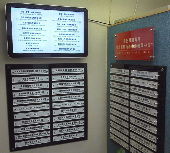 說的通俗點,就是香港注冊署規定香港公司在每個注冊地址都必須放上顯示公司名稱的電子牌,每分鐘輪流展示在該地址注冊的香港公司名稱,不定時會有注冊署工作人員上門檢查監督,若發現沒有看到該公司名稱在水牌上顯示,則會產生罰款。