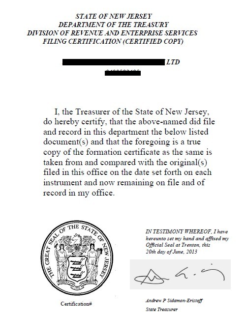 客戶于2013年6月18號遞交我方資料申請注冊新澤西州公司,6月26號順利拿到注冊證書。