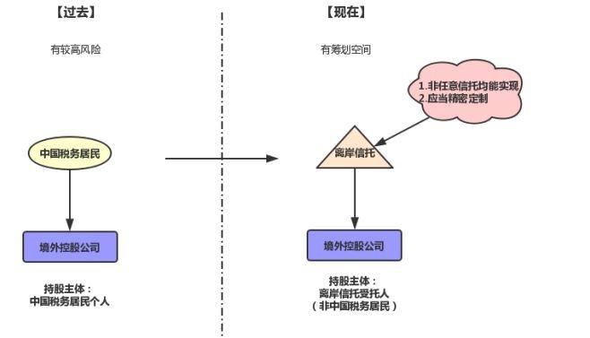 (1)將資產(chǎn)由個人(中國稅務(wù)居民)持有轉(zhuǎn)為由離岸信托(非中國稅務(wù)居民)持有:若相關(guān)人士將由自己直接持有的股權(quán)裝入信托,此時離岸信托作為資產(chǎn)的所有權(quán)主體,境外收益的分紅主體完成了由中國稅務(wù)居民到非中國稅務(wù)居民的轉(zhuǎn)變,在現(xiàn)行稅法下,利潤分配至信托項下境外控股公司暫不需要繳納中國個人所得稅。