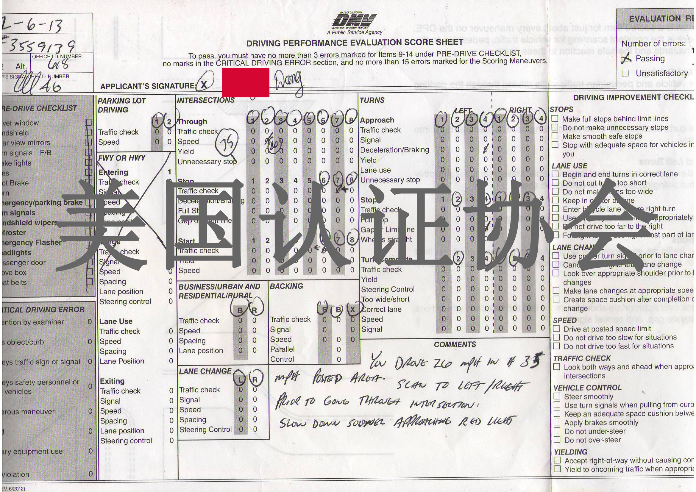 與中國考取駕照大不同的是,在美國報名當天就可以參加筆試,只要是在上午9:00到下午4:00之間的任何時間到筆試房間領取考題,馬上就可考試。考試時間沒有任何限制,只要你覺得題檢查后OK了即可交考卷,當時評分數;語言可選擇英文或是中文(不過是繁體字噢!)。一共36道題,其中26道為文字題,10道為圖題,考試出錯不超過6道題即為考試通過,錯誤超過6道可以在考場外預習十分鐘然后再考一次,不過二次考試的考題肯定和第一次的不同噢,考試通過即可約路考。(本人有考試題,需要來電索取噢400-7227-010)