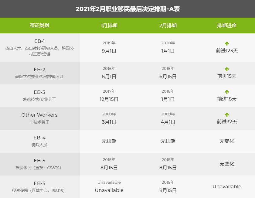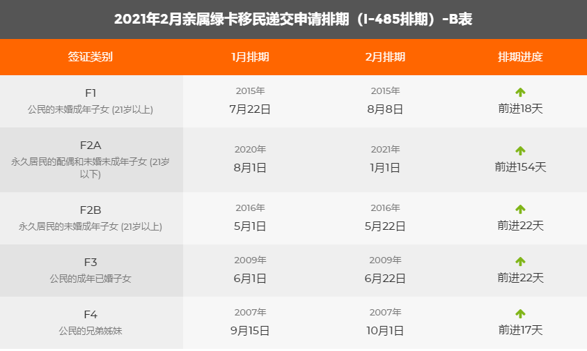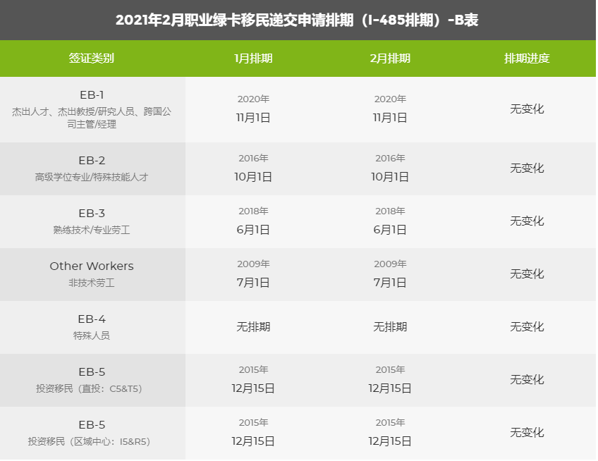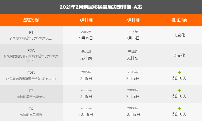 最新消息:國務(wù)院公布的2021年2月綠卡移民排期公布,親屬移民基本停滯,職業(yè)移民各種類型均有前進(jìn)。