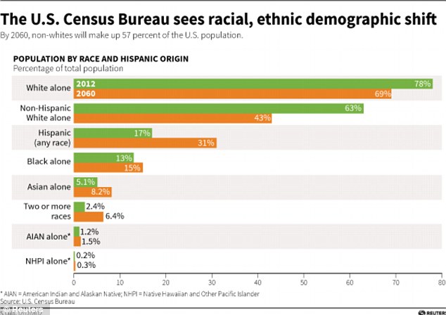 預計到2060年,少數族裔人口比例將從目前的37%,增加到57%,到時候沒有哪個族裔是多數族裔,雖然白人那時還是最大的族裔,占總人口的43%。