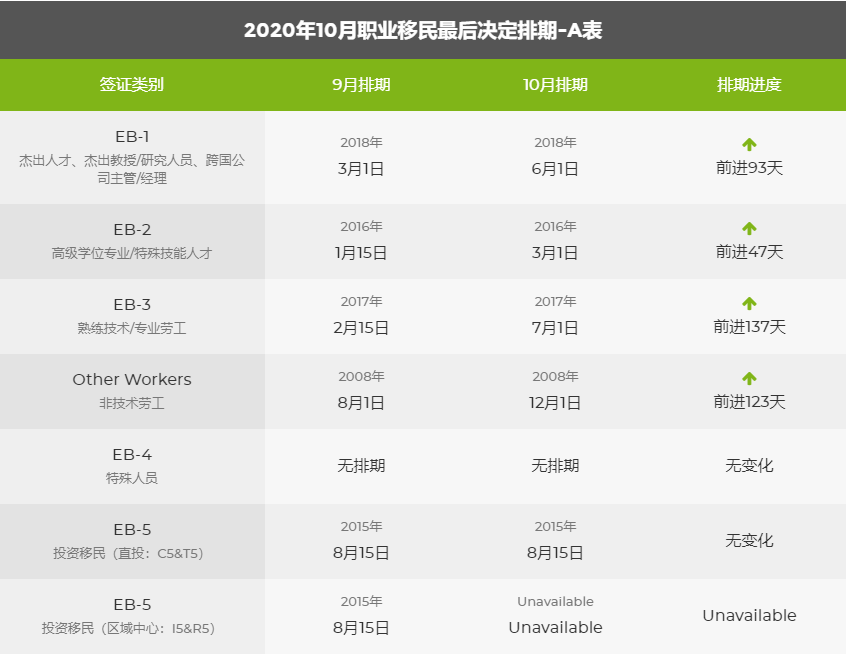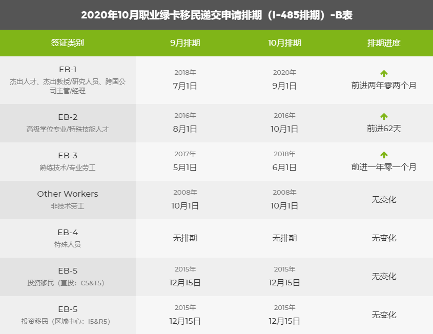 2020年10月綠卡移民排期公布,職業移民有大幅前進!