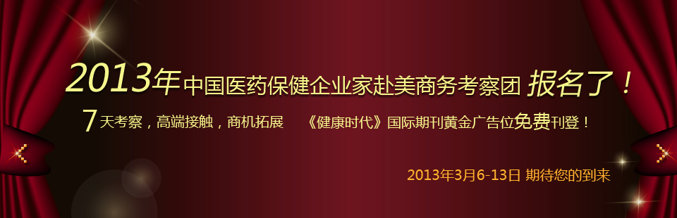 敬請對此感興趣的各界同仁及朋友盡快與我們聯(lián)系,如欲前往,報名從速!所有報名參加本團者,《HEALTH TIMES》(健康時代)國際期刊為您贈送免費廣告1/2版位,期待您的參與,并希望與您一同相聚美國,共話保健及醫(yī)藥產(chǎn)業(yè)的合作與發(fā)展!恭祝萬順!