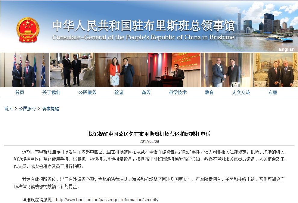 較早前,中華人民共和國駐布里斯班總領事館就發(fā)布過提示信息,稱在澳大利亞布里斯班國際機場發(fā)生了多起中國公民因在機場禁區(qū)拍照或打電話,而被警告或罰款的事件。