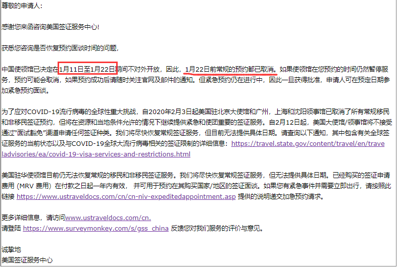 而近日,中國使領館也表示在1月11日至1月22日期間都不對外開放,1月22日前常規的預約都已取消。看來只有疫情有效控制或者結束,美國簽證才能再次開放!